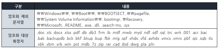 랜섬웨어가 실행되면, [표 1]과 비교하여 암호화 조건에 해당하는 파일을 선별한 뒤 암호화를 진행 한다.