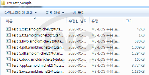 암호화된 파일은 [그림 7]와 같이 파일 이름 끝에 arnoldmichel2@tutanota.com를 덧붙인다.