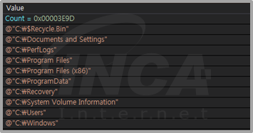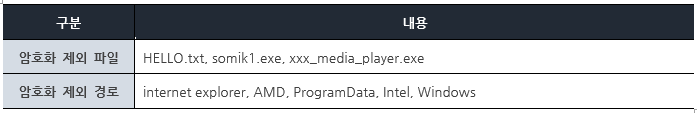 공격자에게 데이터를 전송한 뒤 C 드라이브를 대상으로 다음 [표 1]의 암호화 제외 파일 및 경로를 확인하여 조건에 해당하는 파일을 암호화한다.