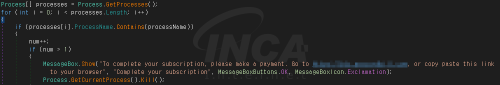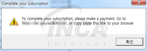 중복 실행 되었다면 아래의 [그림 3]과 같이 “가입을 완료하려면 결제하십시오”라는 내용의 알림 창이 실행되며, 확인 버튼을 누르면 프로그램이 종료된다.