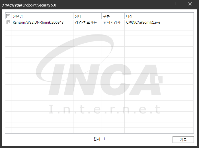 상기 악성코드는 잉카인터넷 안티바이러스 제품 TACHYON Endpoint Security 5.0에서 진단 및 치료가 가능하다.