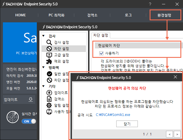 TACHYON Endpoint Security 5.0에서 랜섬웨어 차단 기능을 이용하면 의심되는 파일의 암호화 행위를 차단할 수 있다.