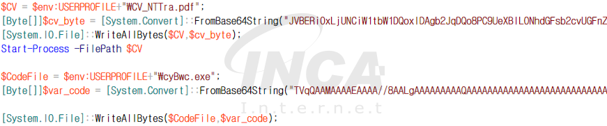 실행 과정을 보면, 링크 파일 내부에는 난독화 된 vb 스크립트가 hta 형식으로 작성되어있다. vb 스크립트 코드는 “%TEMP%” 경로에 파워쉘 스크립트(3.ps1)를 생성하고 실행한다. 생성된 파워쉘 스크립트를 확인해 보면, “%USERPROFILE%” 경로에 개인 정보가 기록된 정상 pdf 파일(CV_NTTra.pdf)과 ‘Bladabindi’로 알려진 악성 파일(cyBwc.exe)을 드롭하고 실행한다.