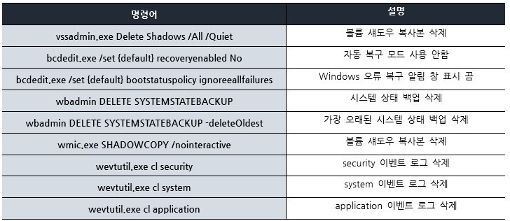 Lockbit 랜섬웨어는 ‘CMD.exe’를 사용해 [표 4]와 같이 볼륨 섀도우 복사본, 시스템 상태 백업 및 이벤트 로그를 삭제하여 사용자의 정상적인 복구를 방해한다.