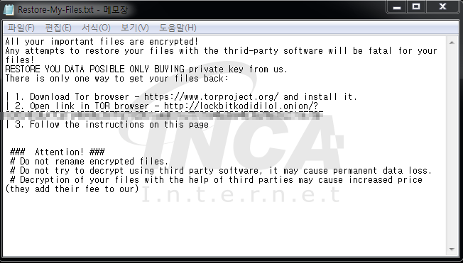 아직 국내에서 감염된 사례는 없지만 지난해부터 출현 중인 “LockBit” 랜섬웨어는 다양한 변종이 출현하며 꾸준히 발견되고 있다. 이 랜섬웨어에 감염되면 .abcd 확장자를 암호화 한 파일에 덧붙이며, 볼륨 섀도우 복사본, 시스템 상태 백업 및 이벤트 로그를 삭제하여 사용자가 정상적인 복구를 하지 못하도록 만든다. 암호화가 완료된 디렉터리에는 랜섬노트가 생성되며 복구 비용의 지불 경로를 알려준다. 최근, 꾸준히 변종이 나오고 있으며, 사용자의 정상적인 PC 사용을 방해하고 있어 상당한 주의가 필요하다.