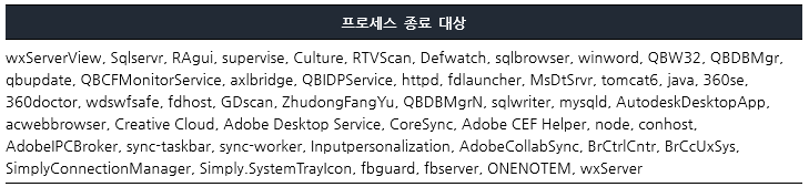프로세스도 서비스와 동일하게 [표 2]의 목록과 비교하여 사용자 PC에서 실행 중인 경우에는 종료한다.