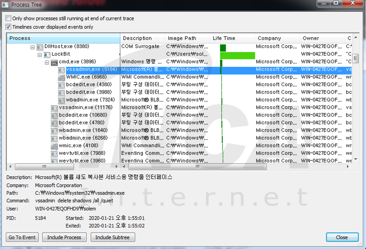 Lockbit 랜섬웨어는 ‘CMD.exe’를 사용해 [표 4]와 같이 볼륨 섀도우 복사본, 시스템 상태 백업 및 이벤트 로그를 삭제하여 사용자의 정상적인 복구를 방해한다.