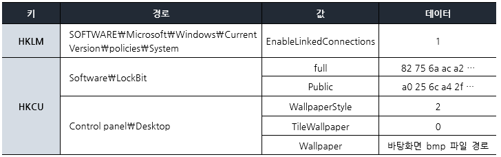 LockBit 랜섬웨어는 암호 키, 바탕화면 변경 등을 위해 [표 5]의 레지스트리 값을 수정한다.