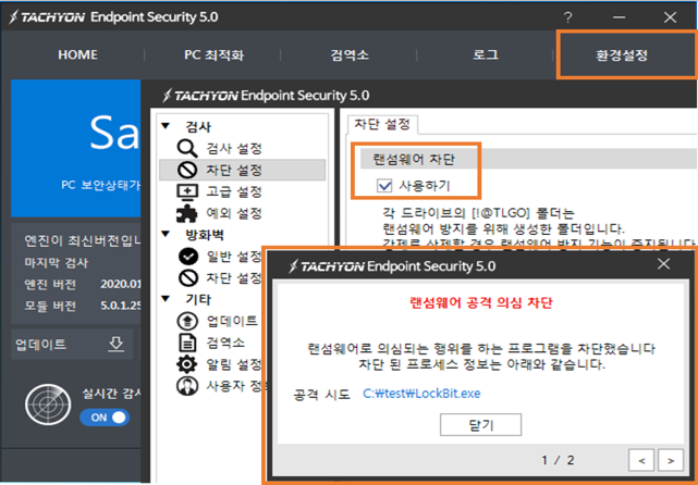 TACHYON Endpoint Security 5.0에서 랜섬웨어 차단 기능을 이용하면 의심되는 파일의 암호화 행위를 차단할 수 있다.