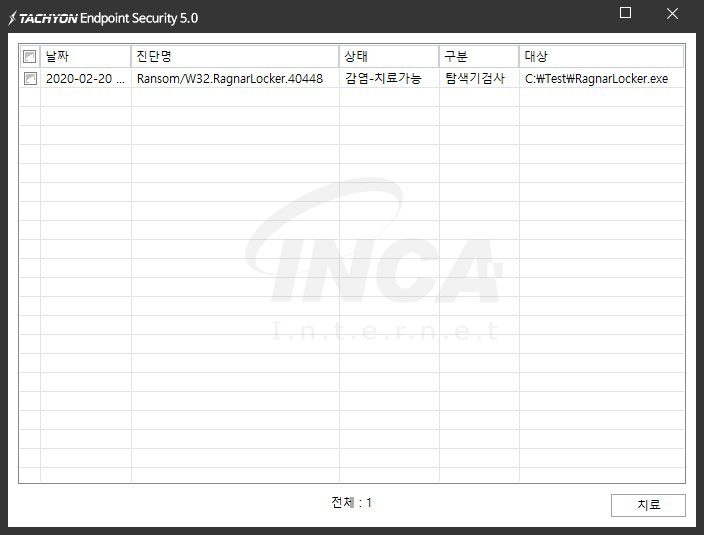 상기 악성코드는 잉카인터넷 안티바이러스 제품 TACHYON Endpoint Security 5.0에서 진단 및 치료가 가능하다.