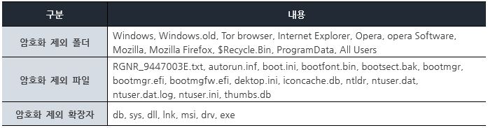 “RagnarLocker” 랜섬웨어 실행 시 [표 1]의 목록을 제외한 사용자의 모든 파일을 암호화한다.