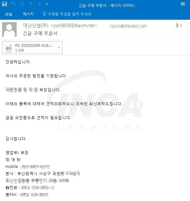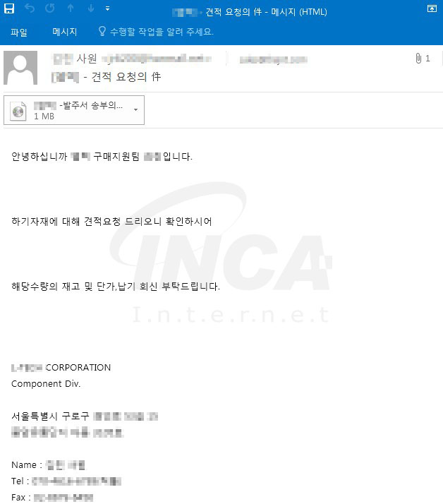 최근 국내 특정기업을 사칭해 견적 요청서로 위장한 스피어 피싱 메일이 발견되었다. 스피어 피싱은 특정한 개인이나 회사를 대상으로 공격을 시도하는데, 아래의 악성 메일처럼 정교한 내용으로 첨부된 대용량 악성 파일을 열람하도록 유도한다.