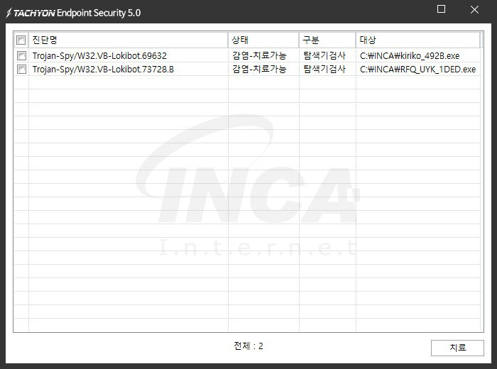 위의 악성코드는 잉카인터넷 안티바이러스 제품 TACHYON Internet Security 5.0에서 진단 및 치료가 가능하다.