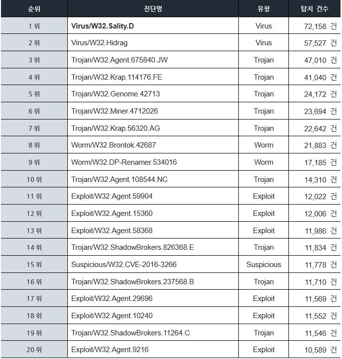 2020년2월(2월 1일 ~ 2월 29일) 한 달간 잉카인터넷 대응팀은 사용자에게 가장 많이 피해를 준 악성코드 현황을 조사하였으며, [표 1]은 가장 많이 탐지된 악성코드를 탐지 건수 기준으로 정리한 악성코드 Top20이다. 가장 많이 탐지된 악성코드는 Virus(바이러스) 유형이며 총 72,158 건이 탐지되었다.