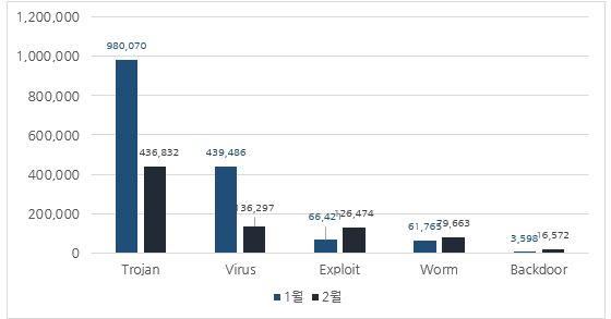 2월에는 악성코드 유형별로 1월과 비교하였을 때 Trojan과 Virus의 진단 수가 감소하였고, Exploit, Worm 및 Backdoor의 진단 수가 증가하였다.