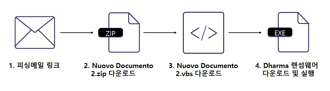 수 년 동안 다양한 변종으로 발견된 “Dharma” 랜섬웨어는, 최근 이탈리아어로 작성된 피싱메일을 통해 유포 사례가 발견되고 있다. 해당 피싱 메일에는 악성링크가 포함되어 있으며, 링크를 클릭하게 되면 악성 파일이 자동으로 다운로드 되고 내부 스크립트 파일을 통해 랜섬웨어가 추가 다운로드 후 실행된다. “Dharma” 랜섬웨어는 볼륨 섀도우 복사본 삭제 및 사용자의 중요한 파일을 암호화하고 있어 사용자의 주의가 필요하다.