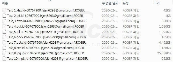 이후 사용자 PC의 파일들을 암호화 하고, 암호화한 파일의 확장자를 .ROGER로 변경한다.