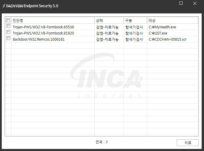 위의 악성코드는 잉카인터넷 안티바이러스 제품 TACHYON Internet Security 5.0에서 진단 및 치료가 가능하다.