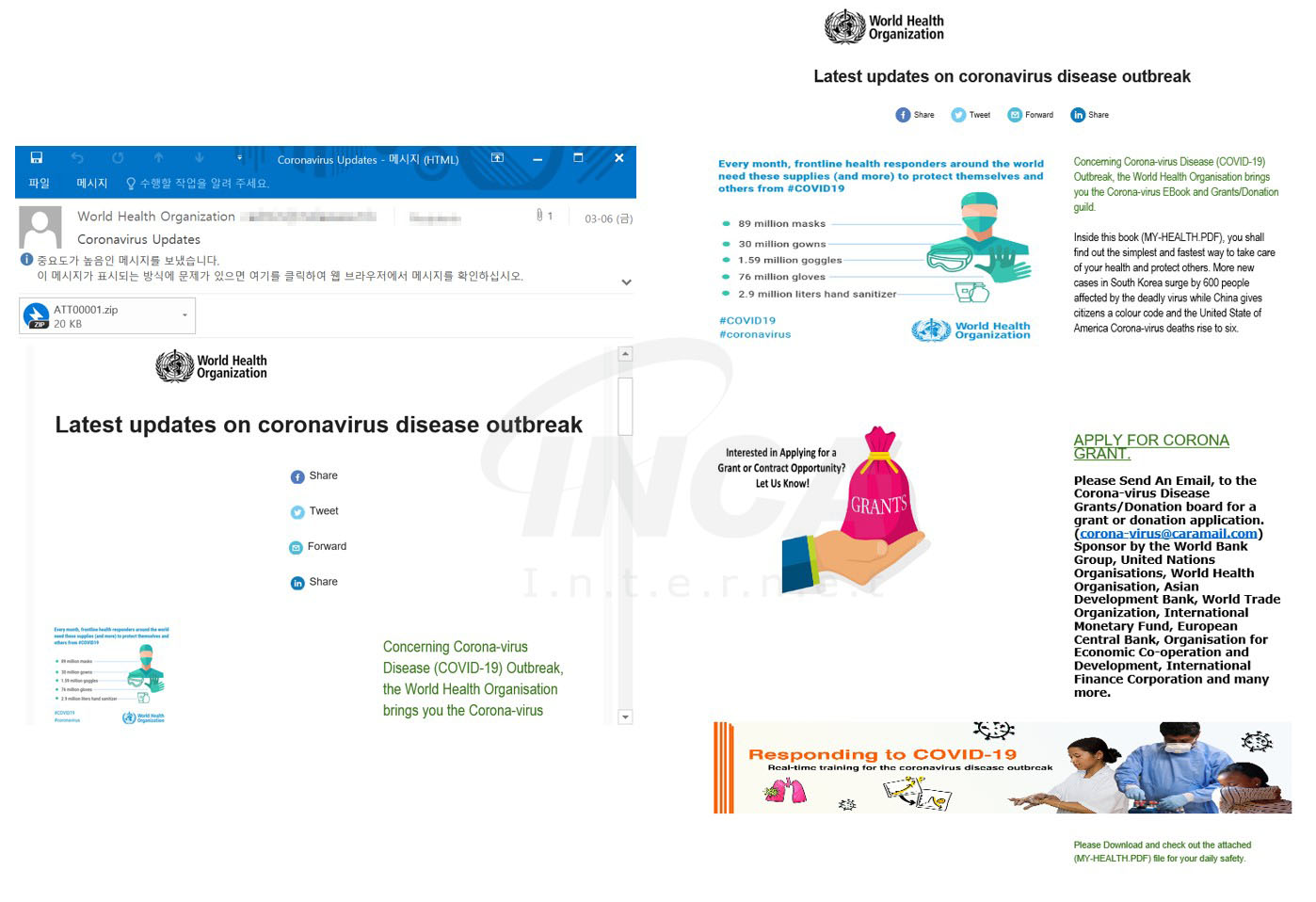또한 아래의 피싱 메일들은 코로나 바이러스 감염자 확인 자료, 세계 보건 기구 WHO를 사칭한 코로나 바이러스 발병에 대한 최신 업데이트 자료의 내용으로 첨부 파일을 실행하도록 유도하고 있다.