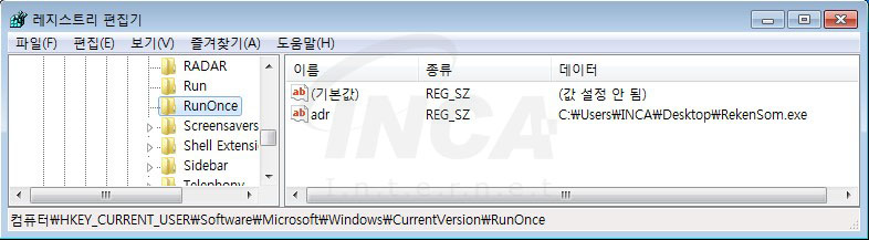 암호화 절차가 완료되면 [그림 8]과 같이 원본파일을 시스템 재부팅 후에도 자동으로 실행 되도록 레지스트리에 등록한다.