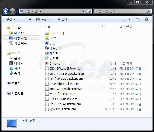 해당 랜섬웨어에 감염되면 확장자는 .RekenSom으로 변경하고 파일명은 랜덤한 글자로 변경된다.