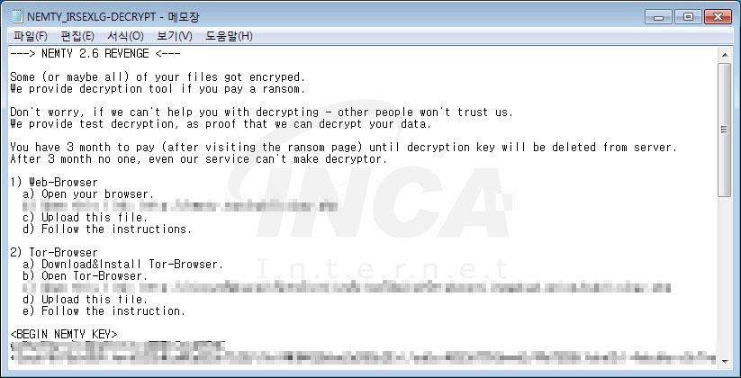 Nemty 랜섬웨어의 새로운 버전으로 추정되는 Nefilim 랜섬웨어가 발견되었다. 해당 랜섬웨어의 유포자들은 암호화된 파일을 복구하는 대가로 금전을 요구하고 있으며, 7일 내로 공격자의 요구에 응답하지 않으면 데이터를 공개하겠다고 협박하고 있다. 랜섬웨어에 감염되면, 확장자가 .NEFILIM으로 변경되며 파일 마지막에 NEFILIM이란 시그니처가 추가된다.