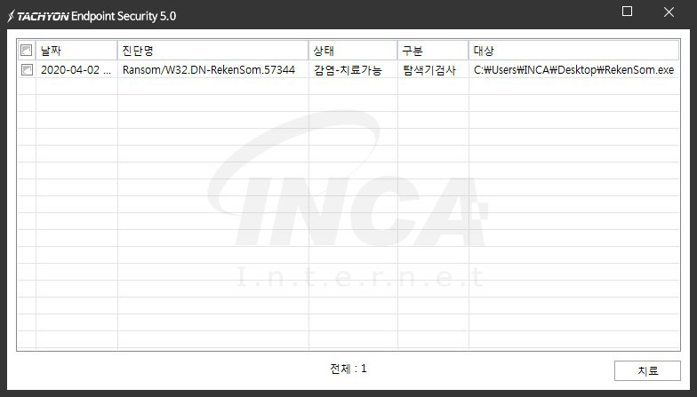 상기 악성코드는 잉카인터넷 안티바이러스 제품 TACHYON Internet Security 5.0에서 진단 및 치료가 가능하다.