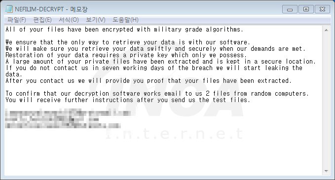 Nemty 랜섬웨어의 새로운 버전으로 추정되는 Nefilim 랜섬웨어가 발견되었다. 해당 랜섬웨어의 유포자들은 암호화된 파일을 복구하는 대가로 금전을 요구하고 있으며, 7일 내로 공격자의 요구에 응답하지 않으면 데이터를 공개하겠다고 협박하고 있다. 랜섬웨어에 감염되면, 확장자가 .NEFILIM으로 변경되며 파일 마지막에 NEFILIM이란 시그니처가 추가된다.