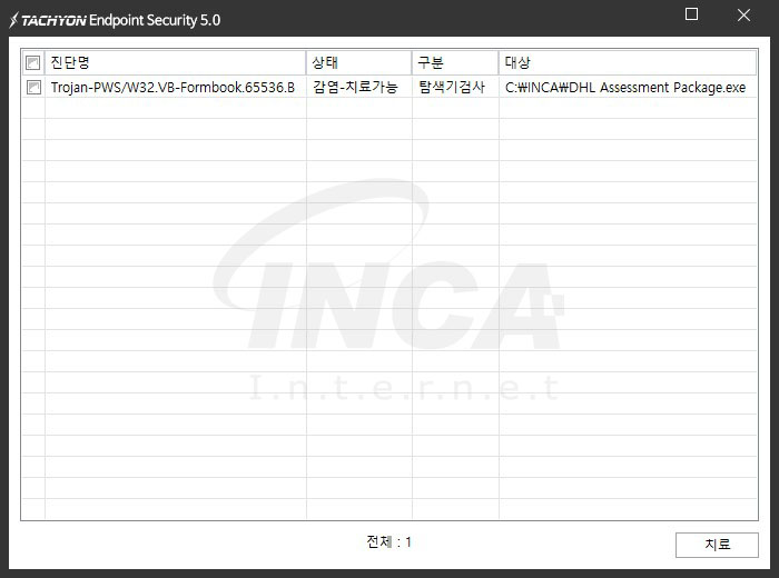 위의 악성코드는 잉카인터넷 안티바이러스 제품 TACHYON Internet Security 5.0에서 진단 및 치료가 가능하다.
