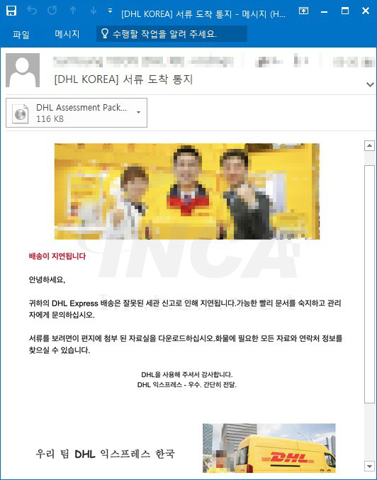 최근 특정 기업을 사칭해 서류 배송 관련 내용으로 위장한 피싱 메일이 발견되어 사용자의 주의가 필요하다. 이번에 발견된 메일의 제목은 ‘[DHL KOREA] 서류 도착 통지’로 되어있으며 잘못된 세관 신고로 인해 첨부파일의 문서를 숙지해달라는 내용으로 첨부파일 실행을 유도하고 있다.