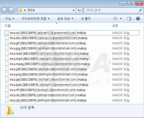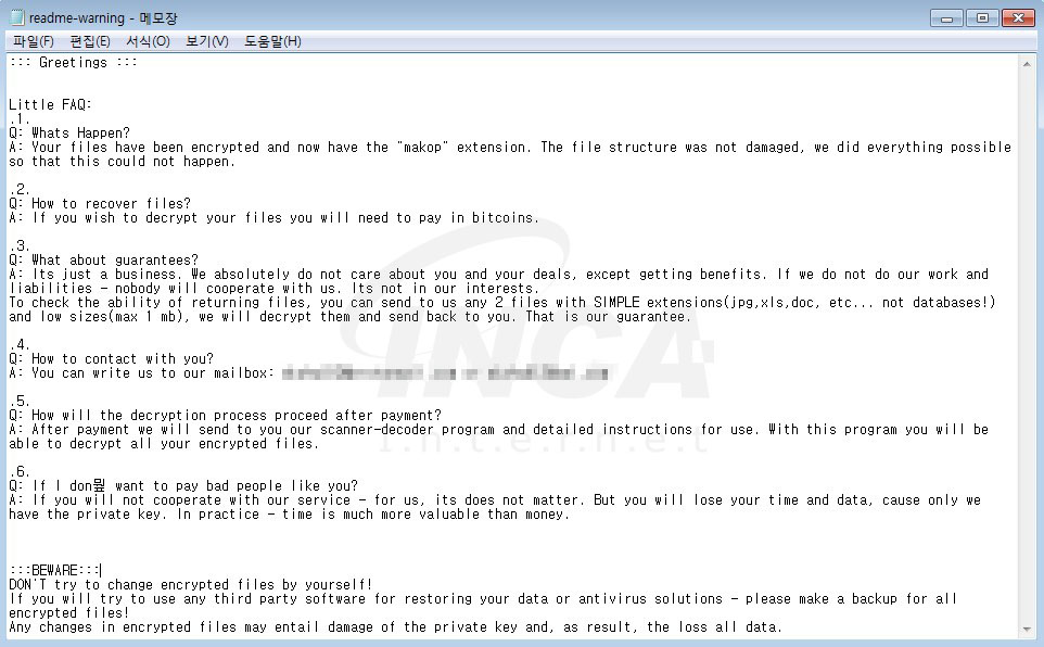 해당 랜섬웨어는 파일 암호화를 진행하고 암호화된 파일의 원본 확장명에 ‘[XXXXXXXX].[이메일 주소].makop’ 형식으로 덧붙이고 ‘readme-warning.txt’ 랜섬 노트를 생성한다.