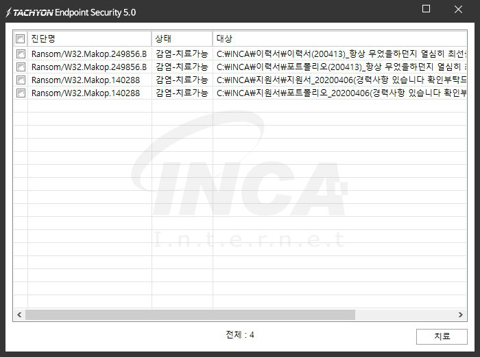 상기 악성코드는 잉카인터넷 안티바이러스 제품 TACHYON Endpoint Security 5.0에서 진단 및 치료가 가능하다.