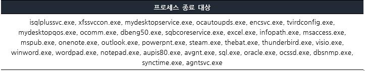 다음으로, 파일 암호화를 하기 전에 원활한 악성 동작을 수행하기 위해 아래 [표 2] 목록을 대상으로 프로세스를 종료한다.