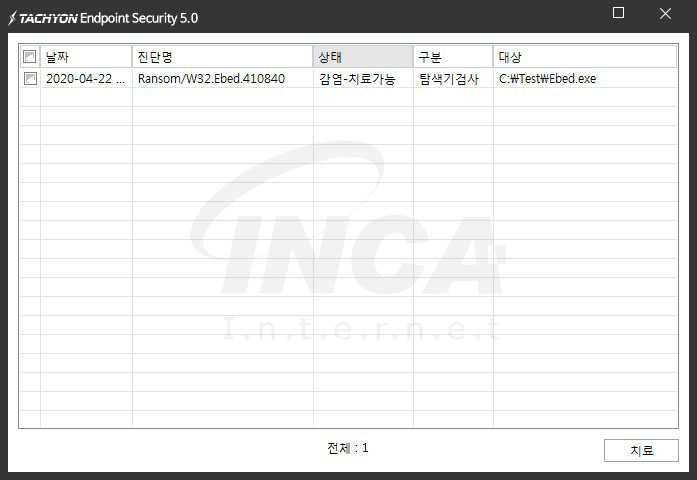 상기 악성코드는 잉카인터넷 안티바이러스 제품 TACHYON Internet Security 5.0에서 진단 및 치료가 가능하다.