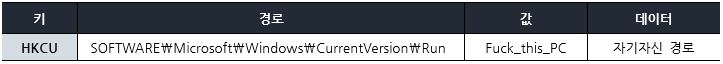 또한, Ebed 랜섬웨어는 자동 실행을 등록하기 위해 Run 키에 Fuck_this_PC라는 값을 생성한 후, 자기자신의 경로를 추가한다.