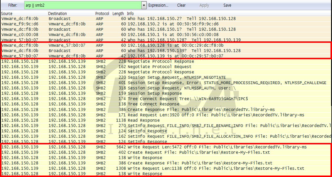 “LockBit”은 실행된 PC를 감염한 후, 네트워크 공유(SMB)로 연결된 다른 PC를 감염시킨다. [그림 12]를 보면 동일 네트워크에서 다른 호스트를 찾기 위해 ARP 요청을 사용한 후, 연결되면 SMB2 프로토콜을 이용하여 연결된 대상 PC 감염 및 랜섬노트를 생성하는 것을 확인할 수 있다.