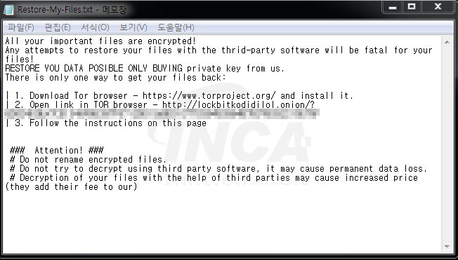 “LockBit” 랜섬웨어 감염이 완료된 폴더에는 감염 사실과 복구 방법을 통보할 랜섬노트(Restore-My-Files.txt)가 생성된다. 이전 버전과 비교했을 때, TOR browser의 링크 경로가 변경됐고, 랜섬노트 마지막에 개인 정보를 다운로드 했다고 언급하는 부분이 추가되었다.