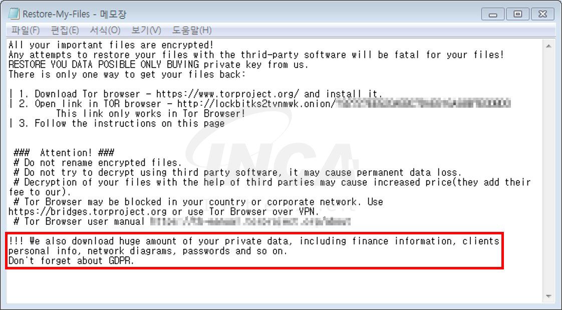 “LockBit” 랜섬웨어 감염이 완료된 폴더에는 감염 사실과 복구 방법을 통보할 랜섬노트(Restore-My-Files.txt)가 생성된다. 이전 버전과 비교했을 때, TOR browser의 링크 경로가 변경됐고, 랜섬노트 마지막에 개인 정보를 다운로드 했다고 언급하는 부분이 추가되었다.