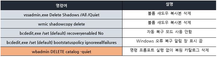 파일 암호화가 완료되면 복구를 무력화 하기 위해 볼륨 새도우 복사본 삭제 및 복구 모드 비활성화 등의 작업을 수행한다. “LockBit”랜섬웨어는 이전 버전에 있던 이벤트 로그 관련 명령어를 사용하지 않고 복원 카탈로그 삭제 명령어를 추가하였다.