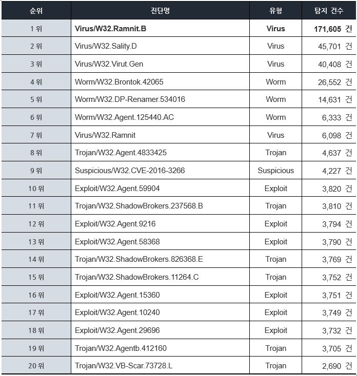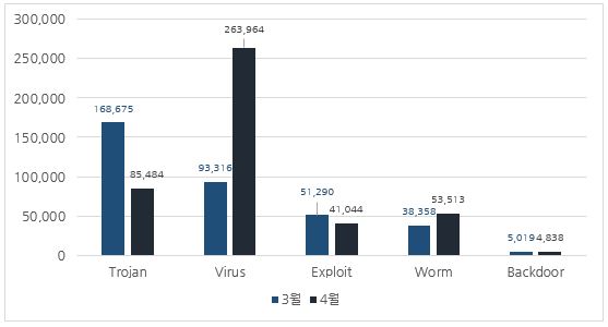 4월에는 악성코드 유형별로 3월과 비교하였을 때 Virus와 Worm의 진단 수가 증가하였고, Trojan, Exploit 및 Backdoor의 진단 수가 감소하였다.