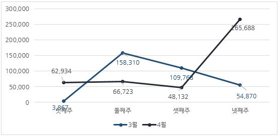 4월 한달 동안 악성코드 진단 현황을 주 단위로 살펴보았을 때 3월에 비해 증가한 추이를 보이고 있다.