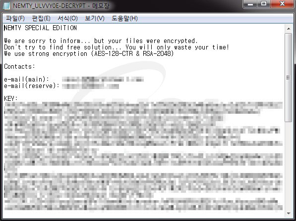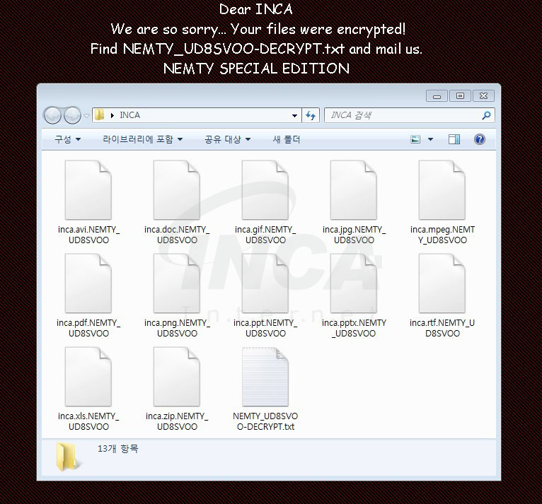 사용자가 공정거래위원회 관련 파일로 착각해 한글 아이콘으로 위장한 ‘Nemty’ 랜섬웨어를 실행할 경우, 해당 랜섬웨어는 파일 암호화를 진행하고 암호화된 파일의 원본 확장명에 ‘NEMTY_XXXXXXX’ 형식으로 덧붙인 뒤, 바탕화면을 변경해 감염 사실을 알린다. 그리고 암호화가 진행된 폴더에 ‘NEMTY_ULVVYOU-DECRYPT.txt’ 랜섬 노트를 생성한다.