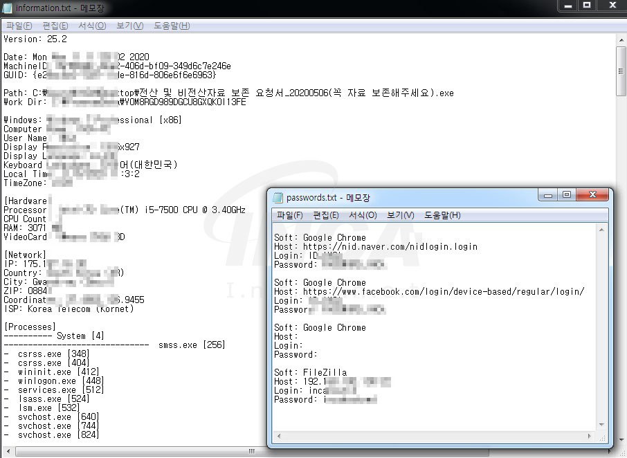 또한 ‘Nemty’ 랜섬웨어와 함께 유포되는 정보 유출형 악성코드를 실행할 경우, 사용자의 시스템 정보와 웹 브라우저 및 FTP 클라이언트 등 저장된 계정정보를 수집해 C2 서버로 전송한다.