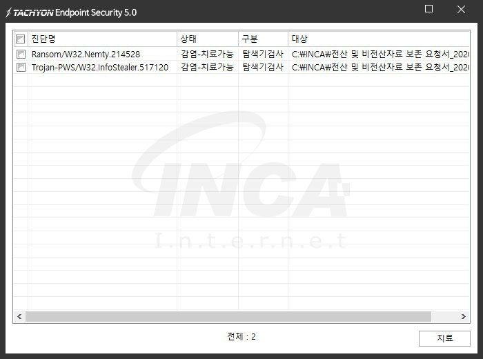 상기 악성코드는 잉카인터넷 안티바이러스 제품 TACHYON Endpoint Security 5.0에서 진단 및 치료가 가능하다.