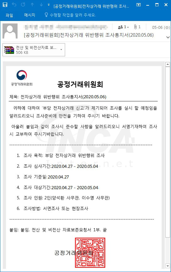 공정거래위원회를 사칭한 피싱 메일이 지속적으로 유포되고 있어 사용자의 주의가 필요하다.