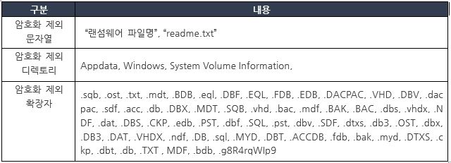 하기의 표와 같이, 해당 랜섬웨어와 랜섬노트 그리고, 특정 디렉토리와 확장자를 제외하고 암호화 동작을 수행한다.