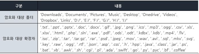 해당 랜섬웨어는 아래 [표1]에 해당하는 폴더와 확장자에 대해 암호화를 진행하고, 암호화된 파일의 확장자 뒤에 ‘.RABBIT’을 덧붙인다.