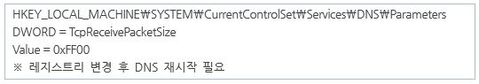 임시 방안으로 아래와 같이 레지스트리 수정을 통해 DNS 응답 패킷의 크기를 제한하여 해당 취약점을 해결 할 수 있다.
