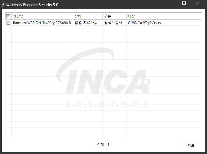 상기 악성코드는 잉카인터넷 안티바이러스 제품 TACHYON Endpoint Security 5.0에서 진단 및 치료가 가능하다.