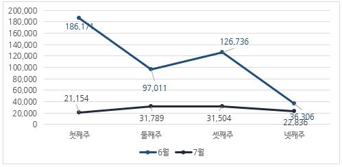 7월 한달 동안 악성코드 진단 현황을 주 단위로 살펴보았을 때 6월에 비해 감소한 추이를 보이고 있다.